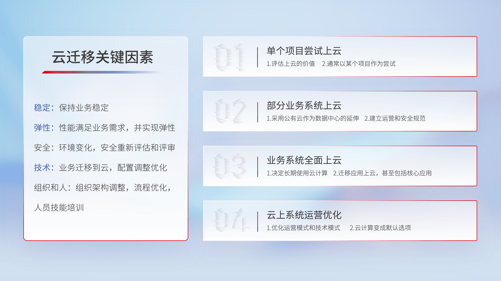 结合实际业务,,从规划设计、、、、云平台选型、、、、云原生改造、、、、数据迁移、、、集成交付,,,,迁移全过程为客户识别最佳上云路径,,,,做好风险识别管理,,设计网络架构、、身份权限、、、、安全审计合规、、、、操作审计、、、、日志审计、、监控告警策略、、、多站点容灾设计等,,对云上基础设施进行整体规划,,,,提升IT治理水平,,以满足弹性、、、高可用、、、、高性能的需求。。。。