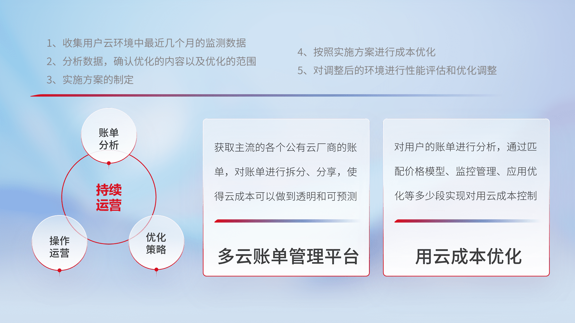 通过多云纳管,,以统一的资源数据模型把客户的云资源进行抽象和封装,,进而实现对多云资源的统一操作,,保障云资源管理的可靠性、、稳定性与可用性。。。量身定制化运维内容,,,配置、、、开发运维、、、、补丁管理、、、、备份、、监控、、认证和访问管理、、审计和日常巡检等,,保障在用云过程中的可靠度,,稳定度以及高可用率。。。。