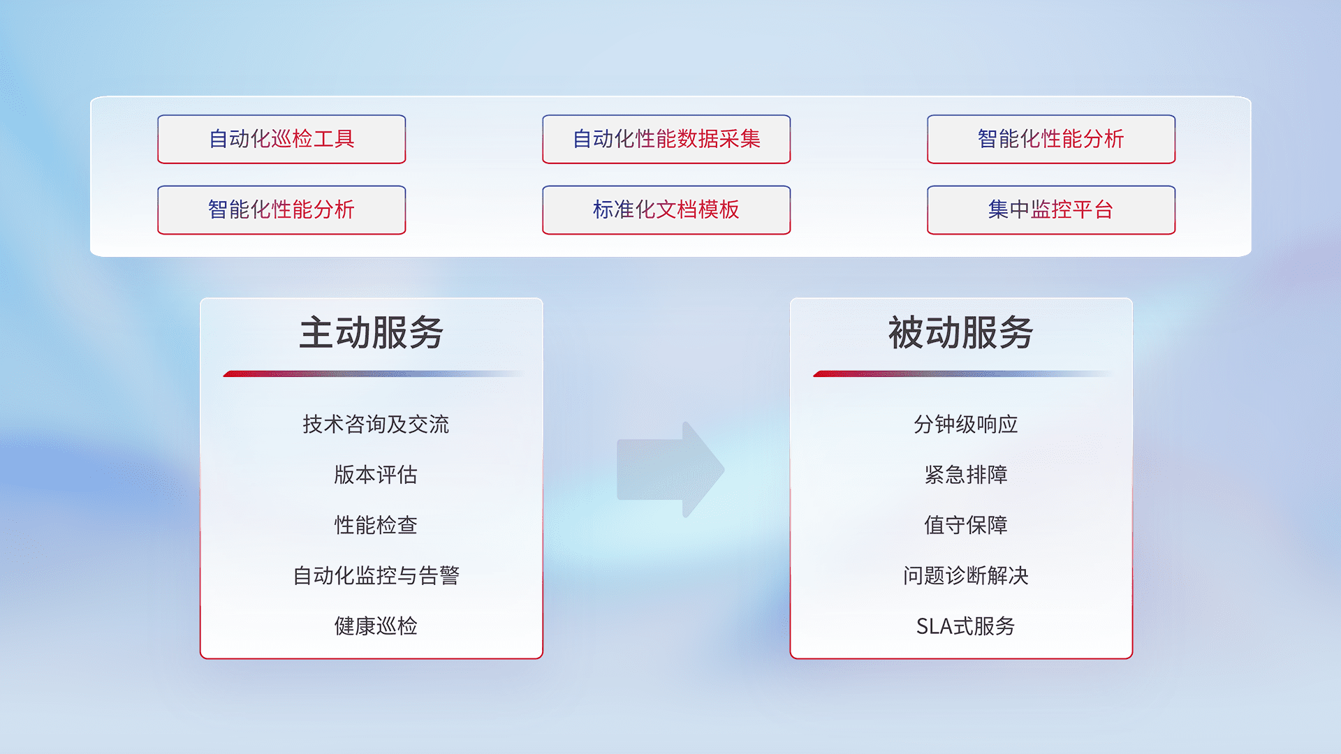 智能化工具和标准化文档,,,,保障服务质量,,提供主动服务(包含技术咨询、、、、版本评估、、、性能检查、、、、自动化监控与告警、、、健康巡检)和被动服务包含(分钟级响应、、、紧急排障、、值守保障、、、、问题诊断解决、、、SLA服务)。。